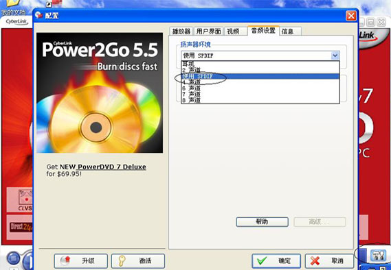 建议先安装PowerDVD,安装完成后会有许多解码功能(有 DD 5.1, DTS 5.1, DD-EX 6.1/7.1, DTS-ES 6.1/7.1 解码)。选择播放的DVD电影,并进行相关设置:配置->“音频设置面板”->“扬声器环境”->“使用SPDIF”即可实现5.1声道输出。如下图: