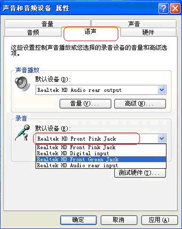 第一步:打开WindowsXP自带的录音机,选择“编辑——音频属性”打开图1-1。在“音频”里将“录音”设置“Realtek HD Front Pink Jack”。